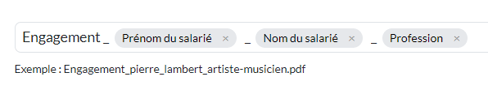 Vous pouvez insérer dans le gabarit du nom de fichier des variables reprenant des informations diverses en fonction du type de document (nom et prénom du salarié, titre et date du projet, etc.). Le document généré portera alors un nom adapté et fiable.