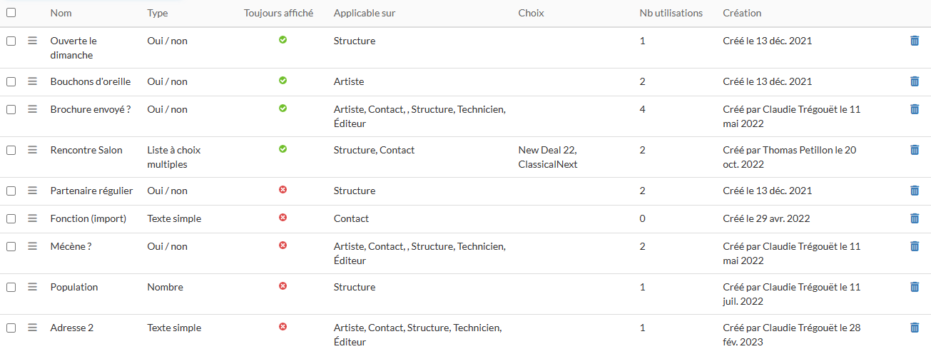 Pour les créer et les administrer, rendez-vous dans l'espace de paramétrage en haut à droite de votre interface et suivez les tutoriels dédiés aux champs personnalisés.