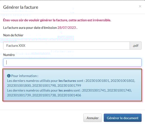 - les derniers numéros utilisés sont classés en fonction de la date de génération de la facture (ou avoir) et non plus du brouillon