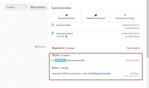 Comme les autres fiches de l'interface, les factures affichent désormais les blocs Tâches et Notes.