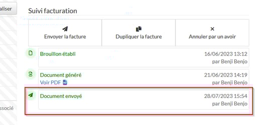 Lorsque votre messagerie est synchronisée avec votre accès Orfeo, vous pouvez envoyer les factures par mail directement depuis Orfeo. Désormais, nous affichons le suivi de cet envoi sur la fiche facture :
