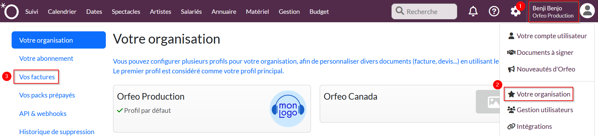 Dans le menu principal, cliquez sur Votre organisation puis sur Vos factures dans la marge de gauche :