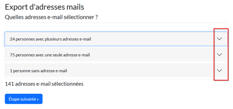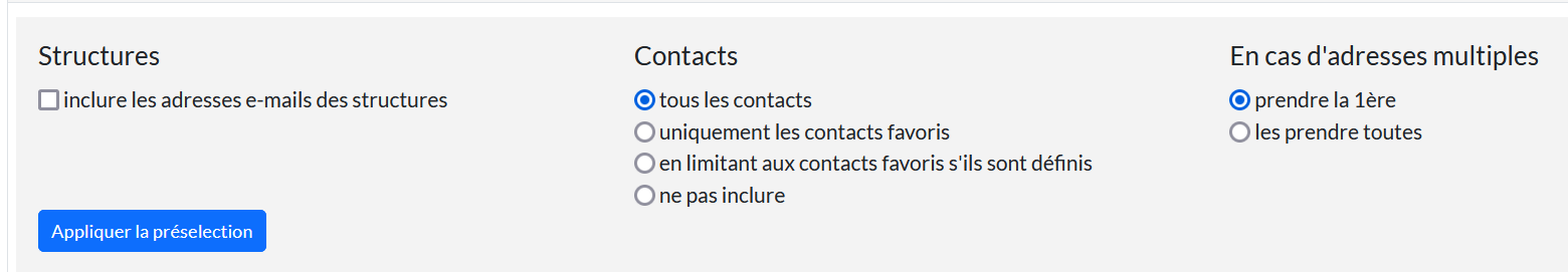 L'outil de sélection des e-mails des contacts se compose de 3 volets dépliables :