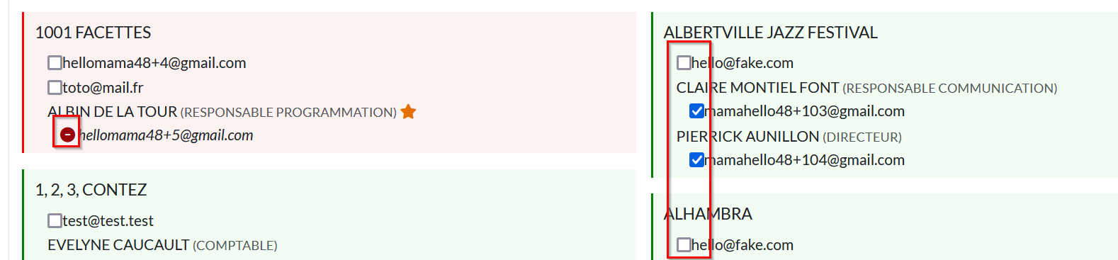 Les contacts pris en compte dans la sélection s'afficheront en vert et les autres en rouge.