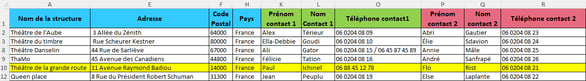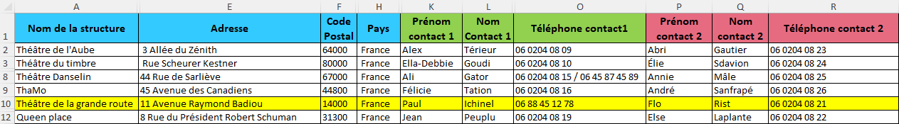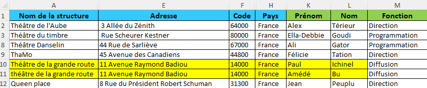 Les structures peuvent être mentionnées plusieurs fois et sur chaque ligne un contact est associé. Dans cette configuration, un seul import sera nécessaire. Il ne créera pas de doublons de structures dès que chaque cellule liée à la même structure sont complétées de la même manière.