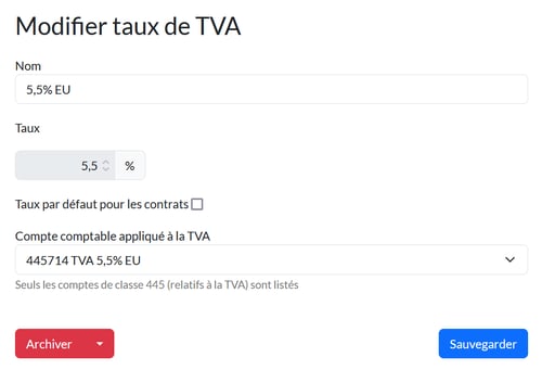 Vous pouvez également ajouter de nouveaux comptes de TVA rattachés à un pourcentage déjà utilisé. Par exemple, vous pouvez disposer d'un taux "20% France" et "20% EU", rattachés à des comptes comptables distincts. Pour cela, cliquez sur Ajouter taux de TVA pour créer une nouvelle ligne.