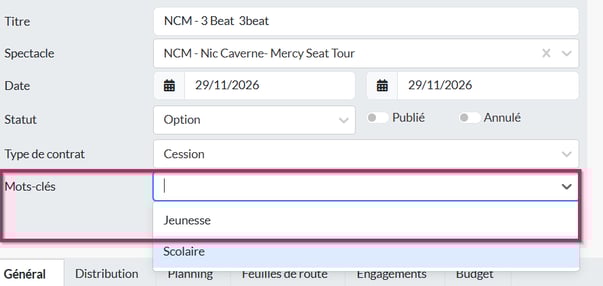 - dans le champ Mots-clés, sélectionnez le mot-clé dans la liste déroulante. Vous pouvez ajouter plusieurs mots-clés.