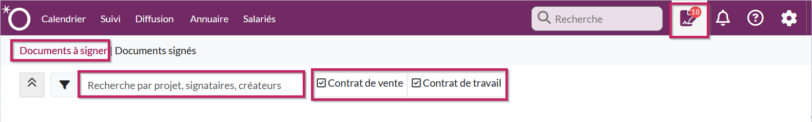 Vous pouvez également filtrer les contrats en cochant les cases Contrat de vente ou Contrat de travail ou en effectuant une recherche par projet, signataire ou créateur.