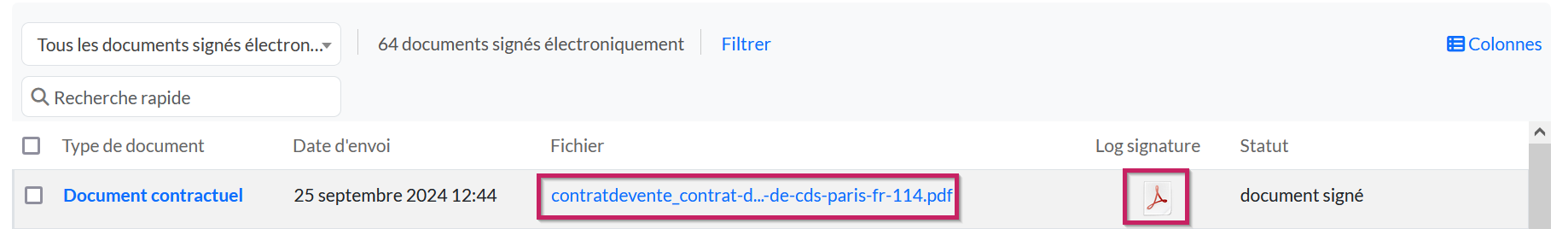 Pour télécharger un seul contrat signé, cliquez sur le nom du fichier dans la colonne Fichier. Vous pouvez télécharger le log de signature pour chaque contrat en cliquant sur l'icône Document PDF dans la colonne Log signature.
