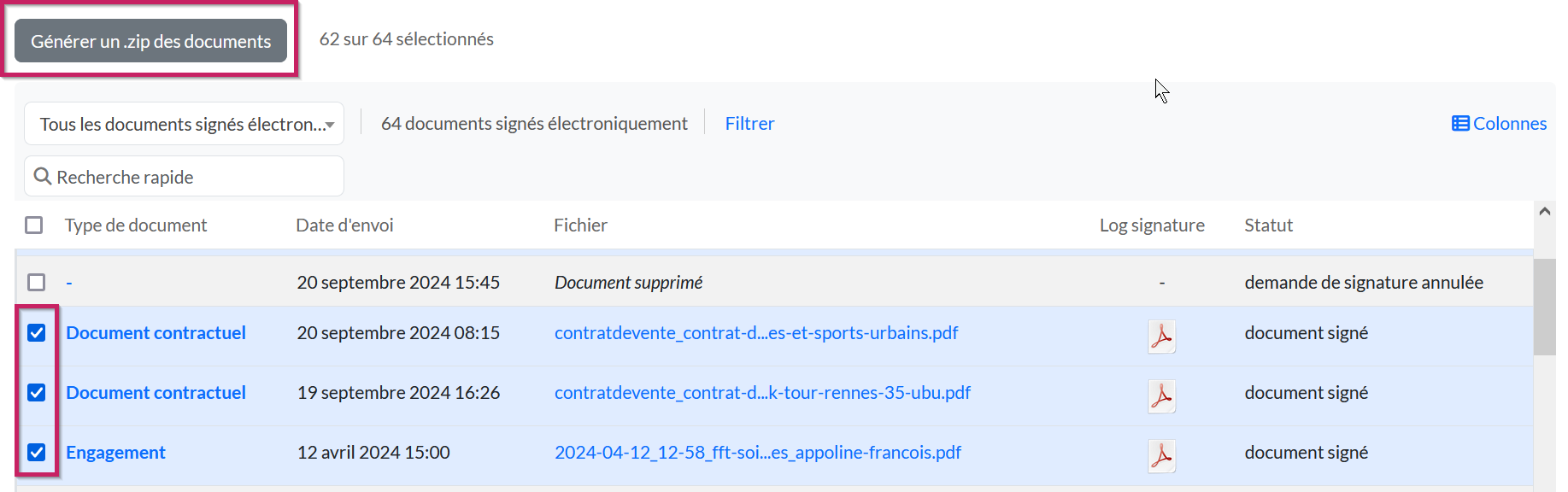 Pour générer un dossier .zip des documents signés avec leur log de signature :
