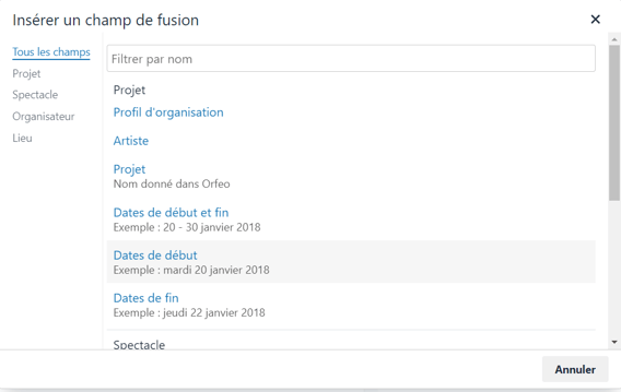 Pour ajouter des champs de fusion, cliquez sur l'icône {;} située à droite de la barre d'outils.