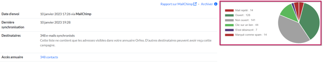 Une fois votre campagne d'e-mailing effectuée via votre outil de newsletter ou un envoi d'e-mails groupés, vous pouvez visualiser les résultats de celle-ci directement dans Orfeo.