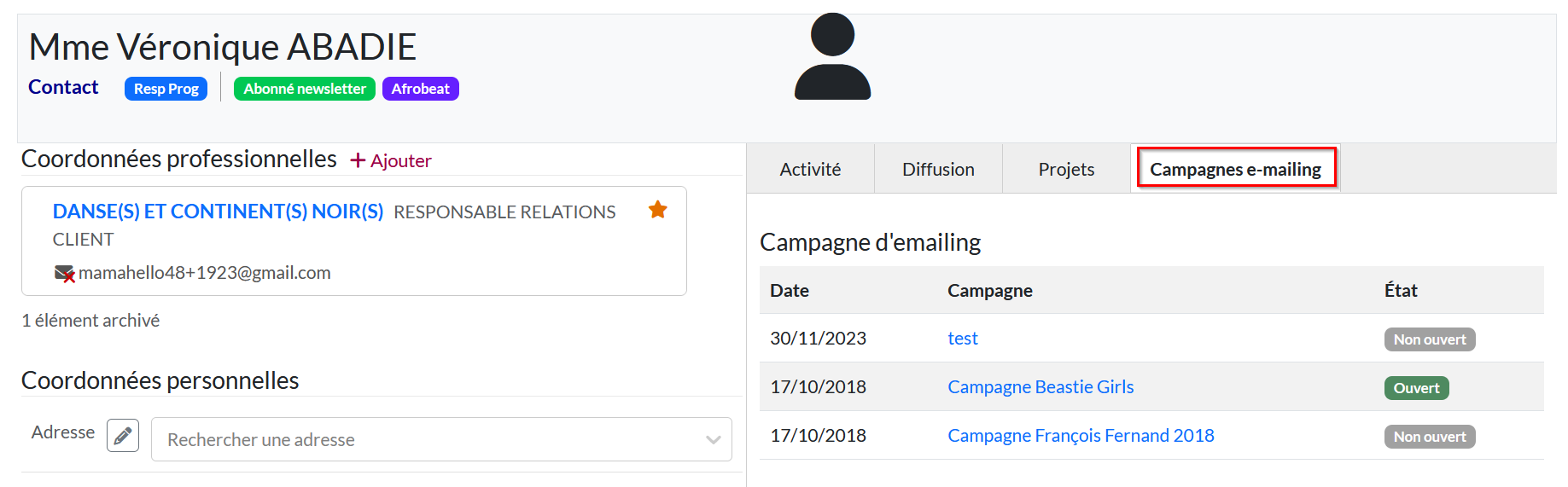 Vous pouvez consulter les campagnes d'e-mailing dont a fait l'objet un contact ou une structure depuis l'onglet Campagnes e-mailing de sa fiche.