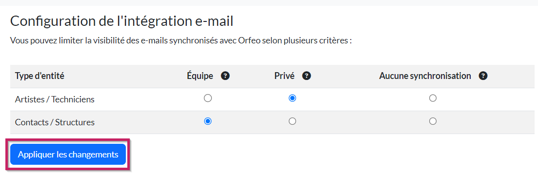 2.  sélectionnez la visibilité souhaitée en fonction du type d'entité (Artistes/Techniciens et Contacts/Structures) :
