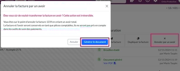 - un message d'avertissement s'affiche indiquant que l'avoir est total et que la facture sera annulée. Cliquez sur Générer le document