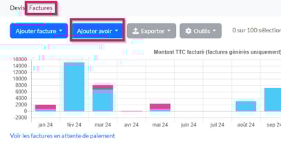 Vous pouvez également générer un avoir partiel en cliquant sur Ajouter avoir depuis le menu Gestion > onglet Factures. Cet avoir ne sera pas lié à un projet par défaut.