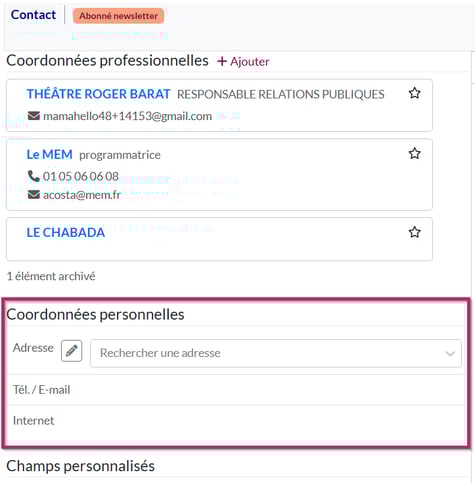 Les coordonnées personnelles sont les coordonnées propres à un contact et qui ne sont liées à aucune structure.
