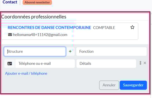 Ce type de coordonnées est lié à une structure. C'est à dire que si des coordonnées professionnelles sont renseignées dans une fiche contact, le contact ressortira sur la fiche structure associée à ces coordonnées et inversement.
