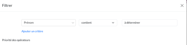 - Vérification des fiches Contact et Structure : certaines fiches Contact et Structure peuvent porter la mention À déterminer à la suite de l'importation (cf. section Vérification des données > les cellules vides du tutoriel Préparer son fichier Excel). Il s'agit de fiches ayant des données associées (ex : des numéros de téléphone, des e-mails) sans la présence de nom ou prénom de contact ou de structure. Sans cette mention, les coordonnées auraient été importées directement dans les coordonnées d'une fiche liée, mais n'aurait pas créé de fiche propre. Par exemple, pour retrouver les contacts concernés, filtrez votre annuaire de contacts à l'aide du filtre suivant : "Prénom + Contient + à déterminer"