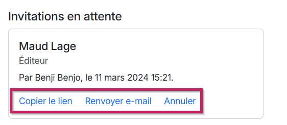 Vous pouvez à tout moment renvoyer l'invitation ou l'annuler depuis cette page. Vous pouvez, par ailleurs, copier le lien d'invitation pour l'envoyer via Whatsapp par exemple.