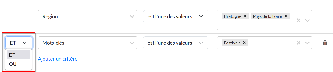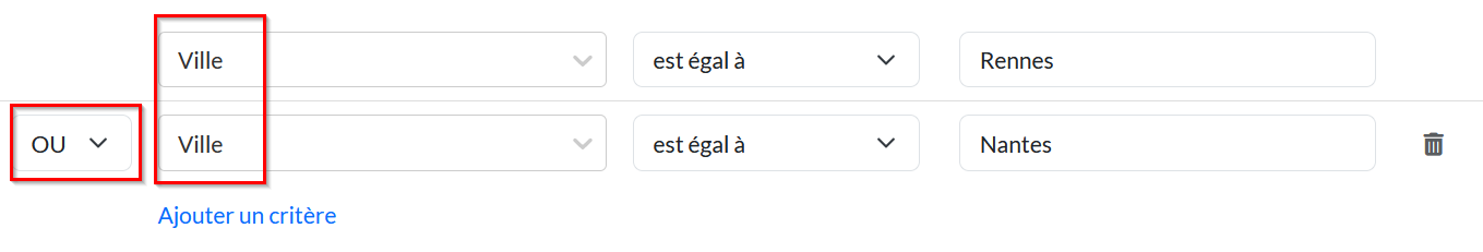 - Si vous souhaitez supprimer un critère, il vous suffit de cliquer sur l'icône Corbeille à droite de la ligne du critère.