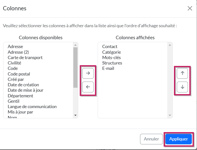 Vous avez également la possibilité de réorganiser l'ordre des colonnes. Pour cela sélectionnez la colonne que vous voulez changer de place et cliquez sur Appliquer.