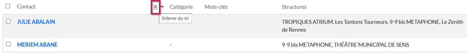 Si vous souhaitez effacer un tri, cliquez sur la croix située à gauche de votre flèche de tri.