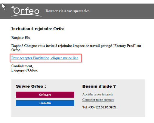 L’artiste/technicien reçoit donc un mail lui indiquant que vous l’invitez à rejoindre votre espace Orfeo :
