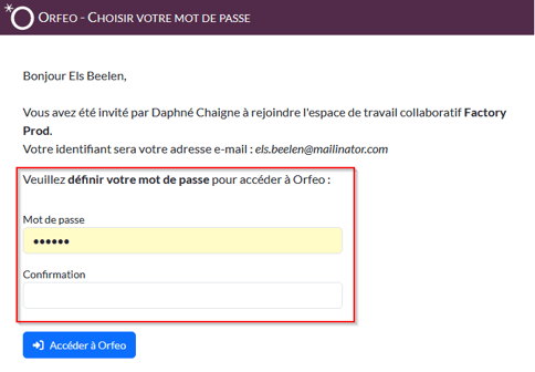 Il doit alors cliquer sur le lien pour accepter l’invitation. Le lien ouvre une page de demande de connexion à la plateforme. Il peut alors renseigner un mot de passe personnel :