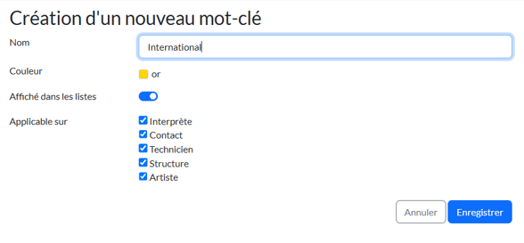 - cochez les types de contacts (Interprète, Contact, Technicien, Structure, Artiste) pour lesquels ces mots-clés peuvent être utilisés