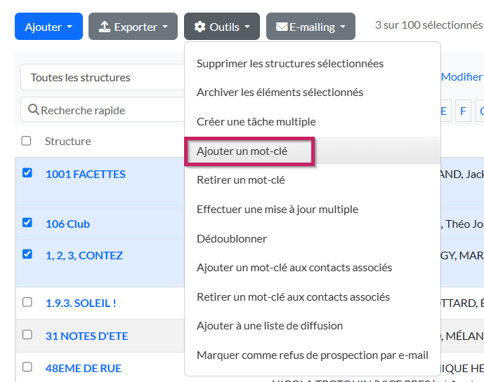 Vous pouvez également effectuer un filtre sur les Mots-clés du contact si vous vous trouvez sur la liste des structures ou sur les Mots-clés d'une des structures si vous vous trouvez sur la liste des contacts.