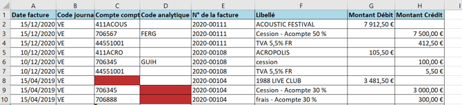 Les cellules en rouge identifient les données manquantes dans l'interface. Vous pouvez ainsi compléter ces informations dans l'interface pour générer de nouveau un Journal de ventes complet.