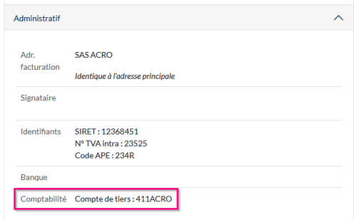 Il est possible d'affecter un compte de tiers personnalisé par structure facturée. Ce champ figure dans les fiches Structures de votre Annuaire, dans le bloc Administratif :